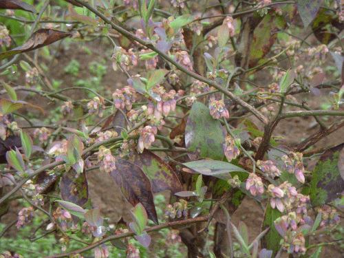 裏山に7~8品種植えてある「ブルーベリー」に花がびっしりと着いている。花は釣鐘状の可愛い(独特の)形で「ドウダンツツジ」や「アセビ」、「シャシャンボ」などに良く似ている。ブルーベリーは背はさほど高くはならないが年々伸び(植え付け5年生で)すでに1.2mくらいになった。