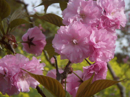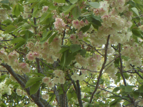 本を見てみると「ギョイコウザクラ」は八重で染井吉野よりも遅く4月下旬が花どきになる。咲き始めの頃は緑色、次第に黄色~薄紅(ピンク)色へと微妙に変化する。当地では珍しい品種なので先日ローカル(テレビ)で放映されたらしい。遠方よりぽつぽつ見学者が見えると言う。