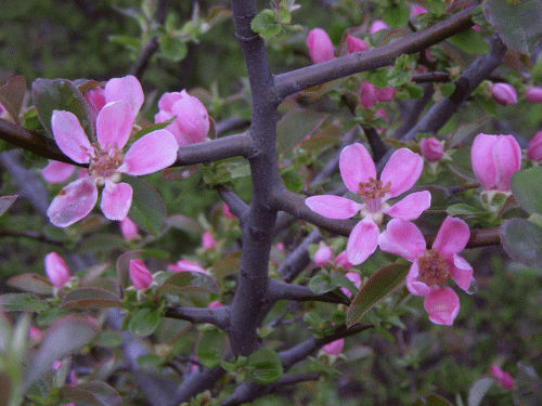 裏山の「ときわまんさく」と「かりん」の花が(雨中で)綺麗に咲いている。白の「常盤万作」は6~7年生、ピンクの「花梨」は(かれこれ)10数年生になる結構な樹齢である。いずれも今年は特に花が多く着いているようだ。