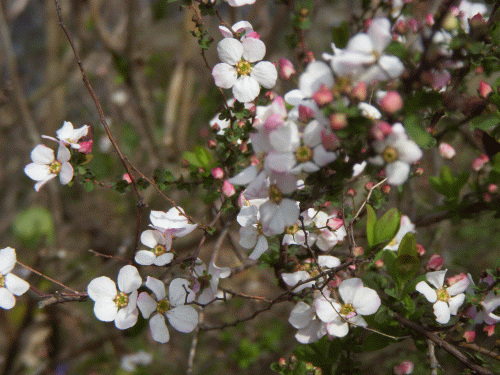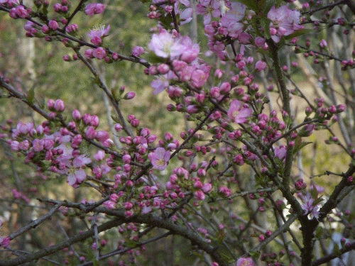 薄紅色の庭梅(別名「林生梅」とも呼ぶ)にビッシリ花が(枝にまとわり着くように)咲いている。落葉低木で樹高は1.5m~2mくらい。ユスラウメに似ているこの樹は中国が原産地だという。開花後(夏に)2mmくらいの実を着ける。熟せば食用にはなるのだが…あまり果肉は無く種ばかりが目立つ。花は優しく綺麗である。