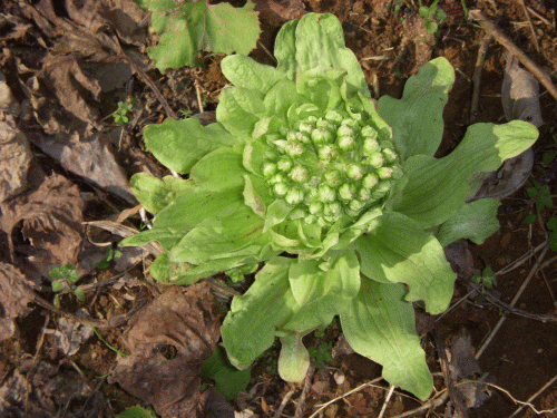 家の横の柿の下に自生している蕗の根っ子から「ふきのとう」が頭をもたげて来た。2週間ほど前に少し芽が出ていたのを味噌汁に入れて食べた。ほろ苦さは独特の味だ。2月の声を聞き、あちこちと花芽が膨らんで来た。もうテンプラにもなりそうな大きさだ。ふきのとうは山菜の中で最も早く食卓にのぼる。これから「タラノメ」、「ワラビ」、「ゼンマイ」、「ツワブキ」、「山椒の芽」など順次若芽を出す季節になる。