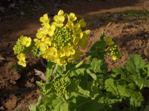 畑に食用菜花を少し植えておいたが(それも)黄色の花を着けている。すでに食べ時期は過ぎた。土作り、景観両用にと、ばら撒いておいた菜種も日に日に大きくなって寒さの中にも春は少しずつ近付いて来た。