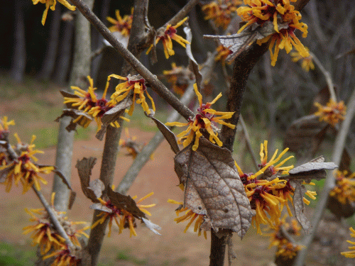 花には特徴があり、タコ足状(紐状)に黄色い花が放射に広がり枝に群がって着く。(落葉樹であるが)冬の間も枯れ葉が(枯れたまま)樹に残り花の横に着いているのが特徴の一つだ。花の(瑞々しい)時期は比較的短くその後はドライフラワー状で残る。法面下の園内道の端では昨年移植した「水仙」が咲き揃い良い香を漂わせている。