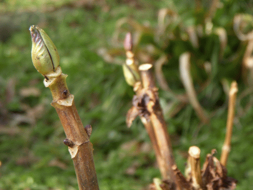 紫陽花の芽は寒さにじっと耐えている。先端の部分は春を感じるセンサーなのだろう。僅かに緑が増して来た。