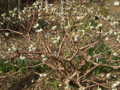 我家には4、5本「三椏」が植えてある。自生種でなく淡い黄色、白っぽいもの、やや赤みかかった花のものなど数種購入して植えた。ミツマタは「コウゾ」などと並びその樹皮は和紙の原料として利用されるが花は可憐そのものだ。枝先は3本、3本と必ず分岐するのが最大の特徴だ。ジンチョウゲ科ミツマタ属で原産地は中国中南部だと言われている。樹高は低く冬季は落葉する。春を告げる花の一つだが(厳寒の時期をじっと耐え)すでに蕾を膨らませている。開花は間もなくだろう。