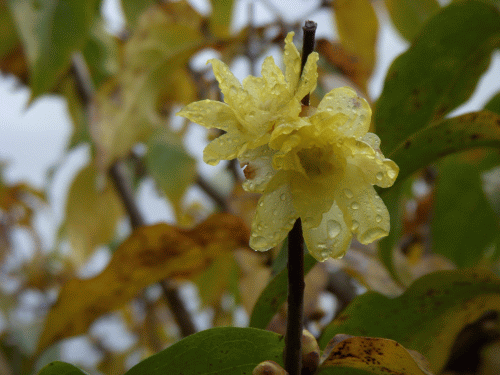 屋敷に数本植えてある「蝋梅」に今年もたくさんの蕾が着いている。先週の(朝晩の)冷え込みとここ数日の雨天とで花がちらほら咲き出した。例年1月上旬頃に咲くのだが…(今年は)若干早いようだ。蝋梅はロウバイ科ロウバイ属の低木の落葉樹で、別名を「唐梅」とも呼ぶ。冬枯れの庭に淡い黄色の花を着けた様子は何とも可愛いものだ。香りも高貴で上品である。花期は長く2月くらいまでは楽しめそうだ。雨上がりの花びらをデジカメに収める。