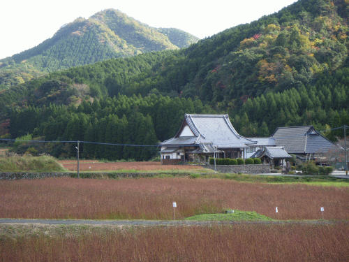 途中、道の駅に寄り「蕎麦」、「豆乳」などを買う。蕎麦は地元(山郷)で集団栽培をしているらしく山間の田んぼ一面に蕎麦が植えられていた。(蕎麦は開花時期はすでに過ぎ収穫間際)あとはコンバインでの収穫作業を待つばかりのようだ。赤茶色の蕎麦の風景は綺麗ではないが絵にはなる。集落の外れに浄土真宗のお寺があり(なかなかいい風景だったので)そこを中心に(蕎麦田を入れ)デジカメに収めた。