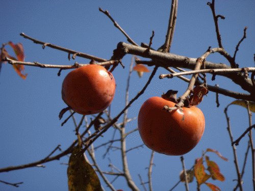 ここ数日小春日和。気温も日中はグングンと上がった。空は抜けるような蒼さだ。屋敷の端に植えてある「葉隠柿」が真っ赤に熟れている。富有などの甘柿はカラスの餌食になったのがほとんどだが、渋柿は僅かに樹上に残った。それでも(葉隠渋柿の方も)2、3日前に数十羽の地ガラスが民家周辺に大群で現れ蜜柑から柿など容赦なく食い荒らして逃げた。
