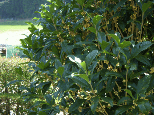 トラクターに乗って帰路につく際にどこからとなくいい香りが漂って来た。「金木犀」が咲き始めたのだ。そう言えば、季節はいつの間にか「神無月」。屋敷の南側にもうかれこれ40年も近く前に植えておいた樹が3本ある。(途中あまりにも樹高が伸びて一時ばっさりと根元から切ったのだが)数年して再び繁茂、今頃になると決まっていい香りを漂わせてくれる。植物図鑑を見ると「金木犀」はモクセイ科モクセイ属の常緑中低木。原産地は中国南部の桂林付近だと言われている。中国ではキンモクセイを「丹桂」または「桂花」などと呼ぶらしい。漢字の「丹」はダイダイ色の意味、「桂」とはモクセイの意味で、日本には江戸時代中葉に渡来したという。花は橙色でごくごく小ぶりだがビッシリとムラなく着いている。派手さは無いが近くを通ったただけで爽やかさが残る良い香りだ。
