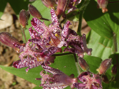 畑の横に「ほととぎす」を植えてあるがちょうど花が満開である。中秋~晩秋にかけ毎年珍しい花を咲かせる。紫のマダラ模様が鳥類の「不如帰」の胸に似ていることから花の名前が付いたのだと言われている。