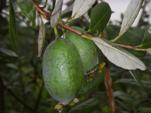 初夏に独特の花を着けた「フェイジョア」の実が熟れ(最近の朝晩の冷え込みで)ボトボトと落果し始めた。落ちた果実はほのかにいい香りがする。樹に成っているのをもいで食するが、核の付近には甘い蜜があって芳香を放つも、さほど美味しいものではない。