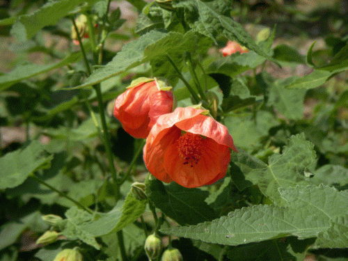 蜜柑の樹の間に観賞用として2本「アブチロン」を植えているがいっせいに咲き揃った。背丈は1mくらい。この花はアオイ科に属する。熱帯性(ブラジルあたりが原産)低木であるが、よほどの寒波が来ない限り冬でも葉は落ちない。