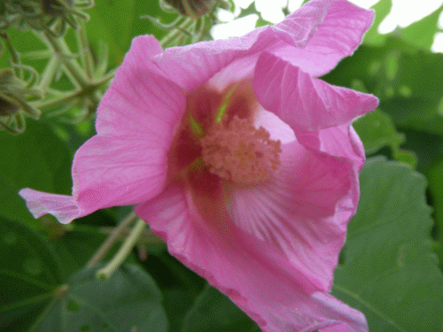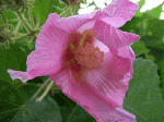 ピンク色の「木芙蓉」に次から次へと優しい花が咲いている。観察していると午前中に開花して夕方は一旦しぼむようだ。むくげやハイビスカスの仲間だというから「アオイ科」の草木である。もうかれこれ20数年も前になるだろうか?普段はあまり親交が無かった隣組のIさんが(どこからか我家が花が好きだと聞いたのか?)木芙蓉の小株を別けてわざわざ我家まで持参をしてくれた。さっそくいただき定植したのだが(不思議なことに)それから間もなくしIさんは逝ってしまった。数年してこの「木芙蓉」が花を着けるようになった。それ以来毎年決まって今頃(夏~秋)花を着ける。この花を見るとIさんのことを思い出す。何とも不思議なご縁である。