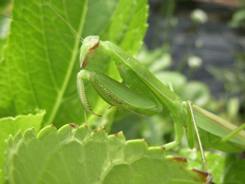 秋野菜の蒔き付け準備で(前作の)マルチ剥ぎ、(後作の)消石灰散布をやっていたら脇の紫陽花の葉に蟷螂(カマキリ)が留っていた。長い前脚をゴソゴソと動かしている様子は何ともグロテスクでもあり滑稽でもある。蟋蟀(コオロギ)は野菜を片っ端から食害するけれど蟷螂による被害はあまり聞かない。主食は何だろうか?