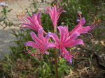 園道の端に植えてある「彼岸花」に今年も花が咲いた。水田の畦などに自生する野生種はもう少し先のようだが、購入した品種もの(早生種)は若干季節を先取りしたよう。見事な紅の花を咲かせた。まもなく深紅系や白系のものも咲くだろう。