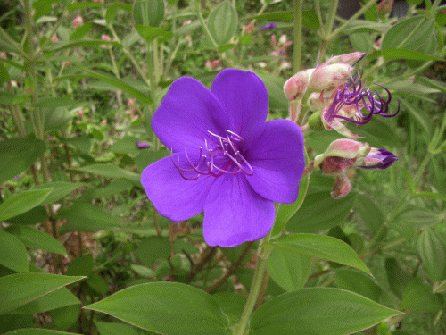 「紫紺野牡丹」はノボタン科の常緑低木。原産地は中南米だというが台湾、中国南部地域にも多いという。暖かい地方の花だけに冬の寒さには弱い。(0℃以下では落葉するようだ)我家でも冬になると落葉するが(それでも株は枯れず)春になると決まって芽が出て来る。紫紺の濃い花びらは吸い込まれて行くようでなかなか魅力的ではある。