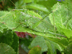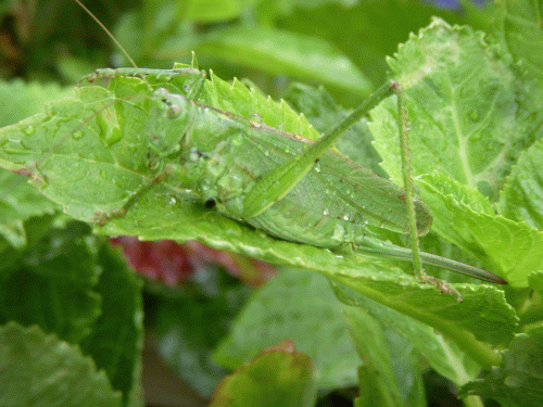 庭の「紫陽花苗」にキリギリスが2匹居りデジカメにて撮影する。キリギリスは夏~秋にかけて良く見かける。バッタ目キリギリス科の昆虫で腹部が太く脚が極端に長いのが特徴。緑色もしくは淡褐色(保護色で)草叢に潜ると何処に居るか姿は分からない。裏山で「チョンギース」、「チョンギース」と大声で鳴くのでにぎやかだ。