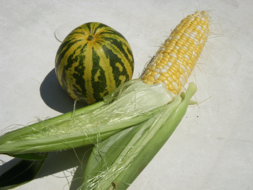 毎朝早くから(4時半くらい?)カラスがガアガア煩く騒いでいる。昨年までは「家付き烏」が2羽居付いていたが、今年は家族が増えたのか?4羽になり作物を荒らし始めた。縞瓜、胡瓜、スイートコーン、トマト、ナス…片っ端から食害。最近はおさがりを人間様がいただくような始末。烏避け人形、脅しテープ、釣り糸…いろいろ対策を講じるも…頭脳は相手の方が数段上のようだ。全面にネットを張る以外には手が無いようだ。