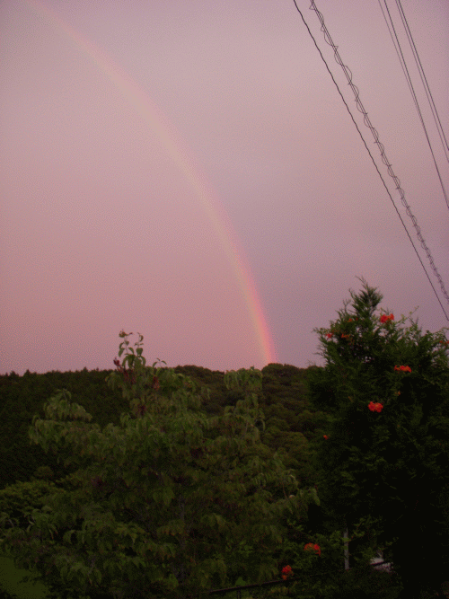 家に帰り脚を洗っている時東の空に久しぶり見事な虹を見た。綺麗な七色の半円だった。