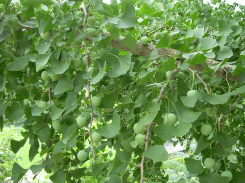 銀杏が鈴なり状態だ。秋には実が熟し、落葉後は黄金色の絨毯を敷く。ギンナンが落ちた時の独特の臭いは嫌いな人も多いけれど…