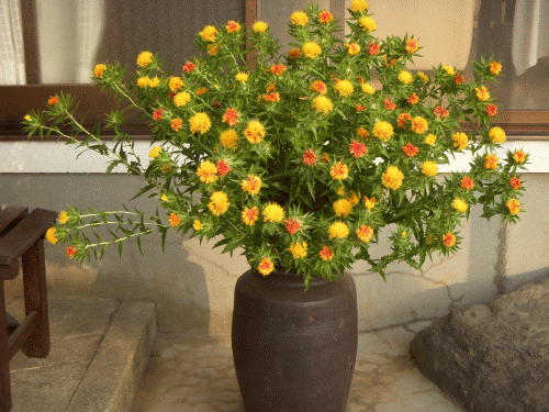 ベニバナはアザミに似た菊科の花でエジプトが原産だとか。地中海~シルクロードを経由し奈良、飛鳥時代の頃に日本に伝わったとされている。1年草で染物や食用油などの原料として生産されているが、観賞用としても立派に通用する。甕への投げ入れも(水揚げが十分で)しばらくは花が楽しめそう。