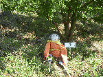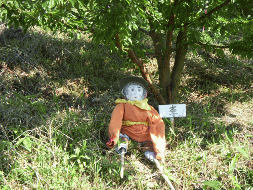 昨日親戚のばあちゃん(Yさん)から貰った「案山子」をさっそく裏山の果物園(李の樹の基)に置く。なかなか愛嬌がある面白カカシである。お陰で殺風景な農園にカカシを1つ置いただけで雰囲気がガラッと変わった。今後もオモシロ「自産自消ふぁーむ」に向けて少しずつ工夫を加えていこうと思っている。