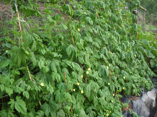 ゴーヤに黄色い花がいっぱい咲いた。ゴーヤはインドが原産地で日本では沖縄地方で主に生産される。沖縄料理ゴーヤチャンプルーは有名。別名ニガウリとか蔓レイシなどとも呼ばれるが、苦いので人によっては好き嫌いがある。私は夏のスタミナ料理として(ゴーヤの)あの独特の味が好きだ。