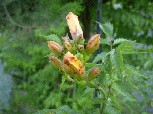 庭に植えてある「ノウゼンカズラ」にポツポツ花が着き始めた。ノウゼンカズラは中国が原産。我国へは平安時代に伝播したらしい。英語名では「チャイニーズトランペットクリーバー」と言う。落葉草木でつる性、オレンジ色を主体にsぎた綺麗な花だ。他の木に吸着しながら樹幹をよじ登る習性があり、吸着した節からは多くの気根が出る。我家ではフェンス横に植えてあるヒノキをつたっている。花には蜜(甘み)があるのか?蟻がさかんに群がっていた。