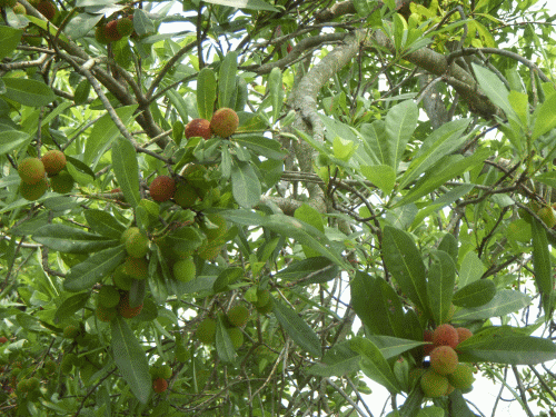 屋敷内に20年生くらいの「山桃」の樹がある。ここ数日の暑さで実が少し熟れて来た。山桃の原産地は中国や日本。常緑高木で雌雄異株。放任しておくと枝が著しく繁茂する。我家のものは栽培向きの大玉改良種。毎年剪定を行うので陽光が良くあたり良く結果する。6~7月頃に完熟するが(味は)甘酸っぱく周りの果肉のみを食べる。しかし種ばかり大きくて生食向きではないのが欠点。今年もホワイトリカーを買って来て「果実酒」にするつもりだが…(漬けるばかりで飲まないのでもう数年前から数瓶貯まっている)