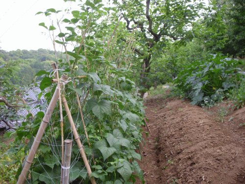 夕方に知人が遊びに来る。アメリカインゲン、ズッキーニ、胡瓜などを収穫し持ち帰って貰う。インゲンマメの生育が旺盛だ。(一気に花が咲きいっせいに実が着くので始末が悪い)少しずつ収穫が出来ればいいのだが…