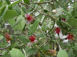 入梅時期の今頃、赤と白の珍しい花を着ける。果実は10月頃に熟し太さはピンポン玉大となる。パイナップルの香りがする不思議な味だが美味しくはなく(一般には)お奨めの果物ではない。もちろん市販などはされていない。花の方が珍重されガーデニング(観賞樹用)樹として1本加えると面白い存在だ。樹高は3~4mほどになる。
