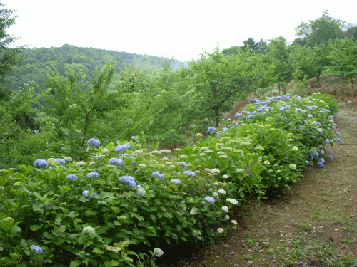 ここ数日の雨模様で裏山の「紫陽花」が急に生き生きして来た。スモモ畑(植え付け後まる4年目)横のアジサイが咲き揃った。こちらも挿し芽してから定植まる4年目。「あじさい小径」も何とか見られるようになった。入梅間近でいよいよこれから紫陽花の七変化の季節である。今年は「おたふく」という品種をはじめ少し珍種を見つけ挿し芽をしようと思う。