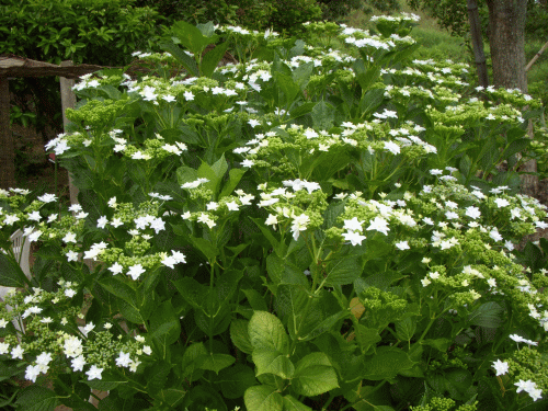それに触発され、自分でも毎年挿し芽を続け(毎年100本近く)せっせと裏の畑(法面)へ植え続けている。知人友人に貰ったもの、園芸店で買ったもの、山採りのもの、自家育成のもの…。種類はヤマアジサイから品種物の紫系、赤系、白系、墨田の花火等々多種多様。本数も毎年増え続けている。花の時期もそろそろだ。