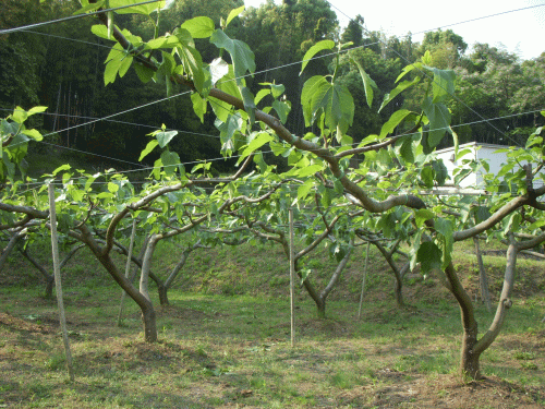 我家では昭和40年頃(当時豊前地域ではぶどう栽培を奨励していた)母親が葡萄の栽培に取り組んでいた。父親は会社勤めだったので指示出しと平日の勤務後や休日利用での力仕事をやり、(普段の作業は)もっぱら母親の役割だった。冬季の剪定~芽掻ぎ~誘引~房揃え~摘粒~袋掛け~雑草取り~収穫作業と結構年中忙しかった。動力噴霧機による病害虫防除作業や力仕事、収穫・出荷作業などは私も手伝いをしていたが、役所での仕事に責任が重くなるにつれ(昭和50年後半頃)栽培は止めた。そのようなことだから葡萄と聞くと何となく懐かしい。定年後は家で食べるくらいは(小面積でも)もう一度栽培をしたいと頭に思い描いていた。ようやく今年の正月に息子の手も借りて本格的な葡萄棚を張った。植栽した苗も現在順調に育っている。葡萄の花を我家で見るのは数十年ぶり。嗅いでみるとほのかにいい香りがした。