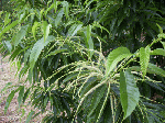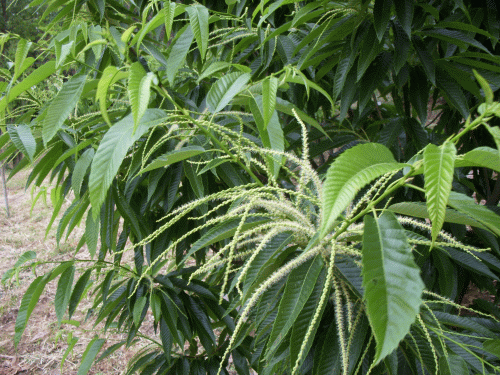 そんな次第で数日間裏山に登らなかったが栗の木に花を発見。我家には定年前植えた栗の木(4~5年生)が50本ほどある。「銀寄」、「筑波」、「丹沢」、「利平」、「伊吹」など数種類あるが今咲き始めたのは早生系統のもの。例年、栗の花は入梅の頃になる。細長いシッポみたいな形をした花で雌雄同株。尾っぽの先部分に雄花がビッシリと着き、元の方には1~2つ雌花が着く。