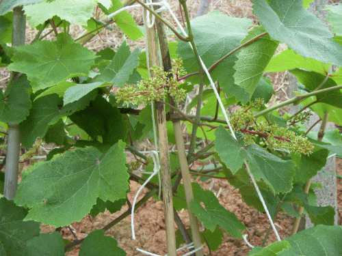 2年前に植え付けた葡萄(マスカットベリーA)に花が着いた。今年は更に「オリンピア」、「キャンベルスアーリー」という異なる品種を加えた。いずれも同じ黒色系の葡萄だ。
