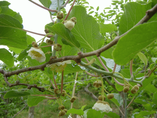 裏の畑のキウイフルーツに花が咲いた。キウイの原産は中国中南部。マタタビ科マタタビ属の落葉蔓性植物で日本では山野に自生するサルナシやマタタビなどの仲間。特徴は雌雄異株で(最低でも)♂♀1本ずつ植えないといつまで経っても結実しない。