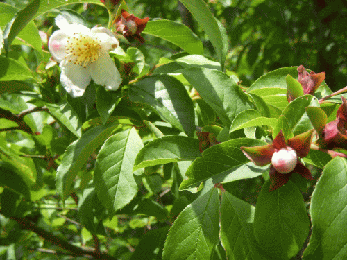 我家の屋敷内に数本ある「ナツツバキ」に花が咲いた。連れ合いが茶花用にと買って来たものを植栽した。10年ほどの年月が経ち樹高は4mくらいに伸張。今年はまた一段と多くの蕾が着いている。