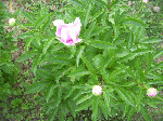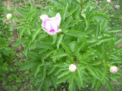 庭のシャクヤク(芍薬)数株に花が咲いた。ボタン(牡丹)に遅れることおよそ2週間。牡丹は樹だが芍薬は多年生の宿根草で茎先に1輪の可憐な花を着ける。おりからの初夏の強い陽射し。水を欲しがっている。