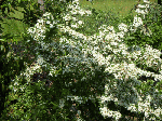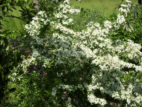 納屋の北側に植えてある「ピラカンサス」に白い花がびっしり着いている。7、8前園芸店にて小苗を買い求めた。あれから幾星霜。樹高はすでに2mを超えた。ピラカンサスは生垣などで見かける。秋~冬にかけては真っ赤な実をビッシリ着ける。たまに黄色の実もある。耐寒性常緑樹でバラ科の中木。別名を「たちばなもどき」などとも呼ばれる。