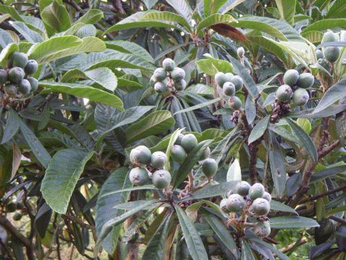 枇杷は初夏を代表する果物。亜熱帯~温帯地方に育ち日本へは中国南部地方から伝播したらしい。年間平均気温が15℃以上で冬の最低気温がマイナス5℃を下らないのが栽培条件。わが国での栽培北限は千葉県。果実や葉は動脈硬化、高血圧症、脳梗塞など循環器系の病(予防)に効用がある。長崎県が主産地で代表的な品種に「茂木」、「田中」、「長崎早生」などがあるが、我家の品種は(随分以前に植えたので)はっきり分からない。おそらく葉形、果実丸みなどから「長崎早生」ではないかと思われる。当地ではまもなく田植えが始まるがオレンジ色の甘い果実が収穫出来のも間もなくだ。