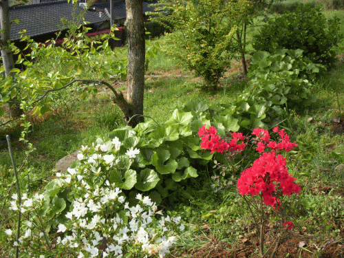 数年前、野にある小株を抜き裏の柿の木周辺に植えた。年を追うごとに繁茂し秋には黄色い花が着く。ツワブキの名の由来は「艶葉蕗」、艶のある葉の蕗ということらしい。キク科の多年草。(赤や白の)ツツジ越し日増しに緑が濃くなっている。