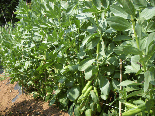 実エンドウ横(隣接)に植えてある空豆(蚕豆又はソラマメ)を本日初めて収穫。日出町へ出かける息子に他の野菜と共に持たせた。空豆は昨秋近所のオバチャン(野菜作り数十年の大ベテラン)から種を分けて貰い植えつけたものだ。