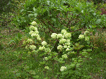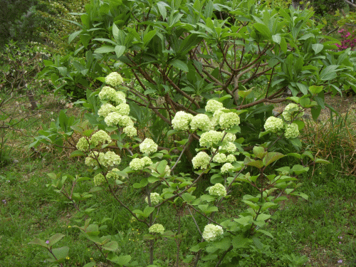 我家の屋敷(南側)に植えてある「オオデマリ」に花が咲いた。幼苗を知人に分けて貰ってから4~5年になる。コデマリはバラ科の低木だがオオデマリはスイカズラ科(樹高は2~3mになる)、花形は紫陽花(ヤマアジサイ)に似る。黄緑~白緑~白と花弁の色が微妙に変化。花は咲くが結実はせず繁殖はもっぱら挿し木。今年は少し挿し芽をしてみよう。