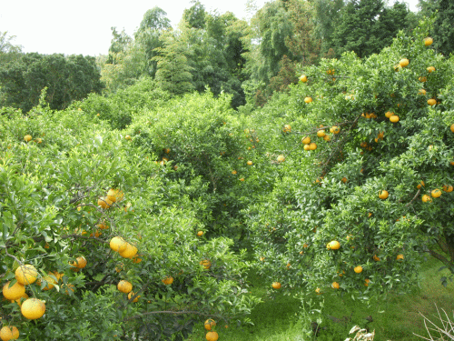今日は裏山のみかん園管理。甘夏柑がたわわに実っている。八朔の時期はとうに過ぎ、5月は夏みかんの収穫期である。友人、知人に(取りに来ないかと)そろそろ電話をかけようかと思う。園には数十本の古木がある。(農業試験場時代の)昭和40年頃に植えつけた。毎年隔年結果することなくよく結実する。例年、この時期の収穫は手間が大変。(坂道でもあるので)直接園まで来て好きなだけちぎって帰ってくれる人が一番いいお客さん。収穫と花の時期が同時だ。