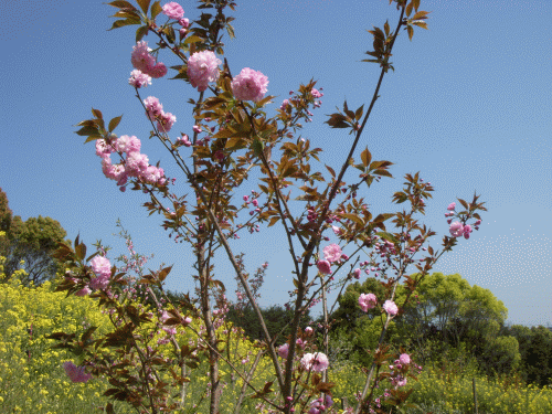 百人一首でこう歌われている「八重桜」が咲いた。4、5年前に我家の裏山へ幼木数本を植えたのが今年は多くさん開花。ソメイヨシノよりは開花が2週間ほど遅い。別名「里桜」とも呼ばれ鈴なりに花を着ける。花びらの数は300枚を超えるという賑やかさ。
