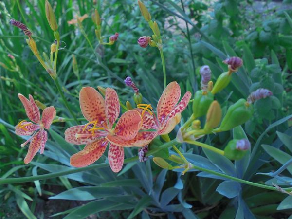 庭の檜扇(ヒオウギ)の花が咲いている。朱色に黒の斑点が入った矢車状の花である。京都の祇園祭りの際には必ず使われる花だという。真夏に咲く花である。草丈は1mくらい、すっと伸びた茎の先に花が咲く。朝方9時頃から咲いて夕方には萎む。葉っぱが広く茎から扇のような形で出るので名前がついたのかも知れない。花はポロッと落ちるため切り花に適さない。秋に真黒い実がいっぱい着き、それが落ちて翌年に芽が出る。