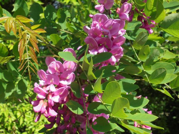 我家の裏山ではニセアカシアの花が満開である。十数年前に知り合いの苗木商から買い求めたものだが、成長が早いこと。はや樹高が7、8mにもなっている。アカシアの花は本来、白系が主流だが、我家のは赤系で、正式にはベニニセアカシアと呼ぶらしい。マメ科の落葉高木で、5月上旬に花がびっしりと着く。藤の花(房)を短くしたような花である。別名をハリエンジュ(槐)ともいう。綺麗な花が咲くと思い苗を買い求めたのだが、地下茎(根)から直接地表に芽を出して、次々と繁殖するので倒すのに正直困っている。実際に育ててみないと植物の特徴は分からないものである。