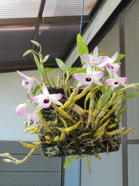 ニホンミツバチの分蜂時期もどうやら終わったようである。設置した箱には入れ代わり立ち代わり蜜蜂が出入りをしている。今は蜜柑の花の蜜が主流だが、もう少しすると蜜源が少なくなる。その頃に咲くのが栗の花で、蜜蜂にとっては貴重な花になる。昨日、蜂蜜蘭とも呼ばれているキンリョウヘン(金陵辺)の鉢を3つ(隣町の親戚筋にあたる)Mちゃん宅に夫婦で返しに出かけた。Mちゃんはちょうど前日に田植えが終わったとのことで、時間があり、ニホンミツバチの生態などの話を聞いた。帰り際に軒先や庭にいっぱい吊り下げてあった「デンドロビウム」という蘭の花をいただいた。西洋ランの一種で、日本ではこれに近いものが石斛(セッコク)という岩場に咲く蘭の仲間らしい。4月~5月頃が花期で、清楚な花である。デンドロビウムは寒さに弱いが、冬季は納屋などに入れておけば、野外に吊り下げて置くだけで、過保護にしなければ育つらしい。