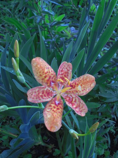 庭で檜扇(ヒオウギ)の花が咲いた。アヤメ科の常緑多年草で、緑濃く、扇のような葉っぱが特徴で草勢は強い。草丈は60cmくらい伸び、茎の先に橙色の(黒のゴマダラ入り)花が咲く。冬には黒い種が残る。ヒオウギは昔は貴族に好まれた花だという。京都の祇園祭の際には必ずヒオウギを飾ると聞いているが、今年は全国的に「コロナ禍」で中止を余儀なくされている。ヒオウギの需要もずいぶん落ちていることだろう。